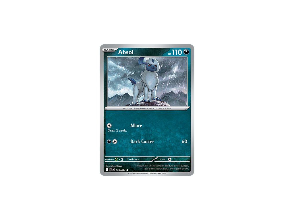 Kusová Pokémon karta Absol 063/094 REVERSE HOLO pochází z edice Mega Evolution—Phantasmal Flames. Jedná se o originální kartu v anglickém jazyce, vhodnou především pro sběratele, případně pro hraní Pokémon TCG.