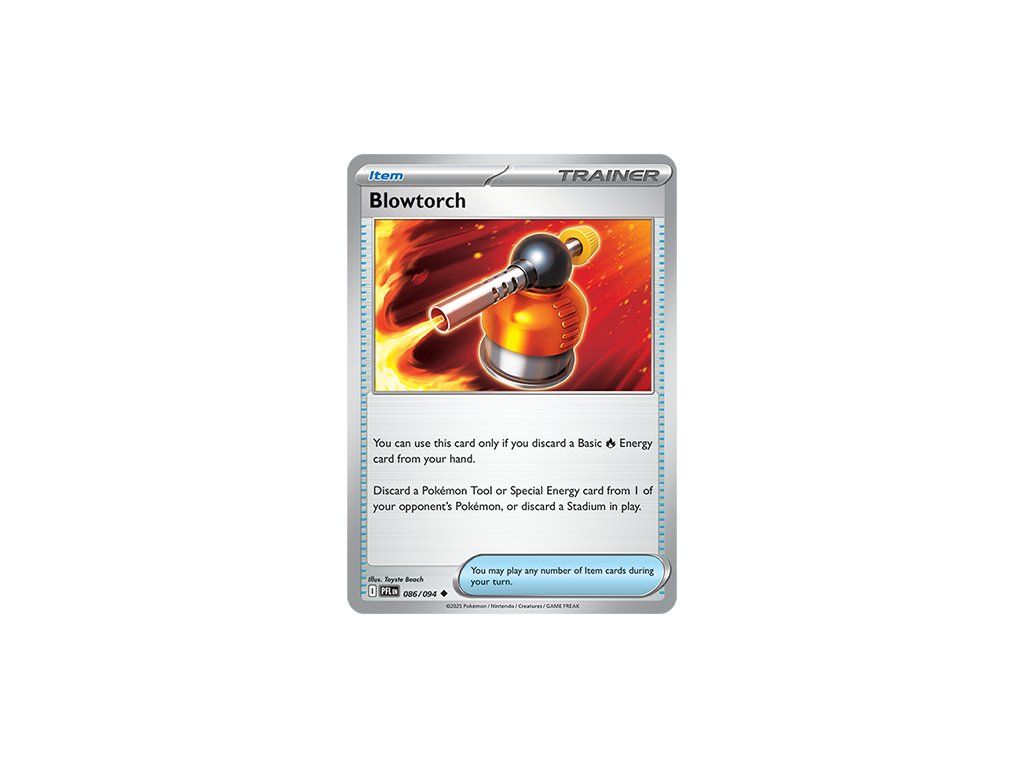 Kusová Pokémon karta Blowtorch 086/094 REVERSE HOLO pochází z edice Mega Evolution—Phantasmal Flames. Jedná se o originální kartu v anglickém jazyce, vhodnou především pro sběratele, případně pro hraní Pokémon TCG.