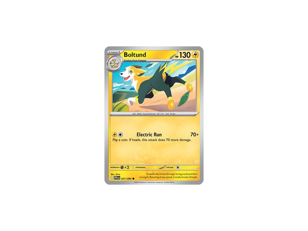 Kusová Pokémon karta Boltund 031/094 REVERSE HOLO pochází z edice Mega Evolution—Phantasmal Flames. Jedná se o originální kartu v anglickém jazyce, vhodnou především pro sběratele, případně pro hraní Pokémon TCG.