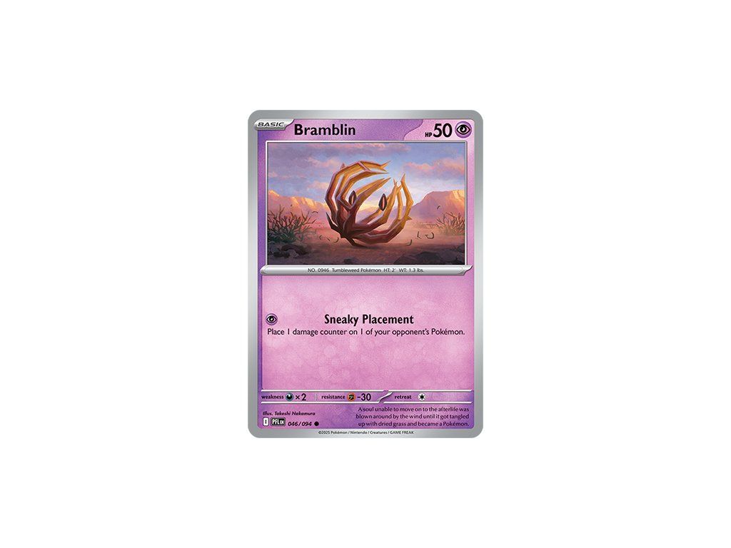 Kusová Pokémon karta Bramblin 046/094 REVERSE HOLO pochází z edice Mega Evolution—Phantasmal Flames. Jedná se o originální kartu v anglickém jazyce, vhodnou především pro sběratele, případně pro hraní Pokémon TCG.