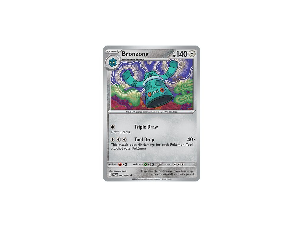 Kusová Pokémon karta Bronzong 072/094 REVERSE HOLO pochází z edice Mega Evolution—Phantasmal Flames. Jedná se o originální kartu v anglickém jazyce, vhodnou především pro sběratele, případně pro hraní Pokémon TCG.