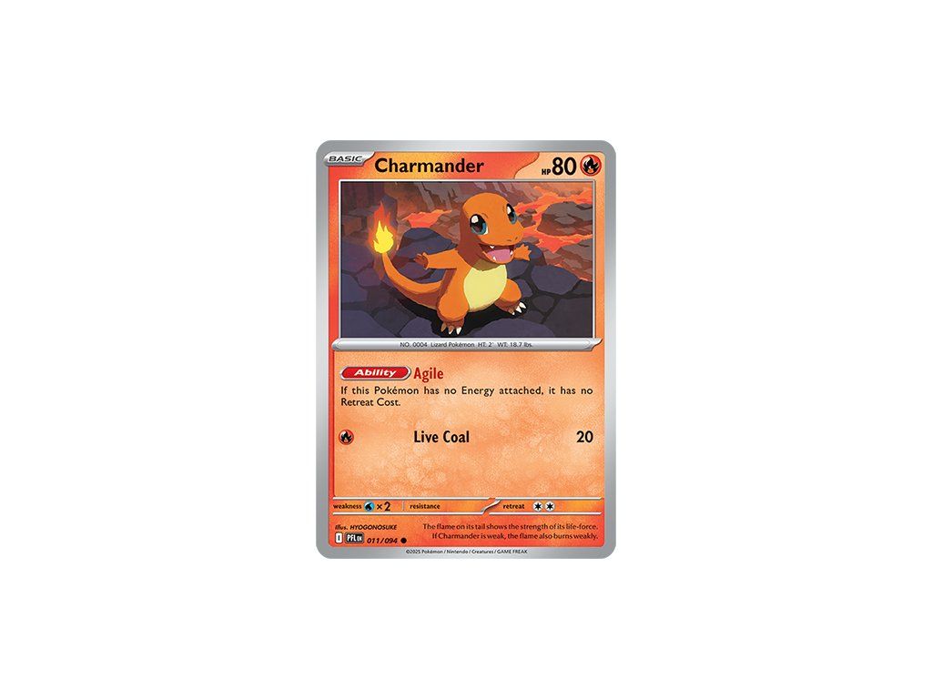 Kusová Pokémon karta Charmander 011/094 REVERSE HOLO pochází z edice Mega Evolution—Phantasmal Flames. Jedná se o originální kartu v anglickém jazyce, vhodnou především pro sběratele, případně pro hraní Pokémon TCG.