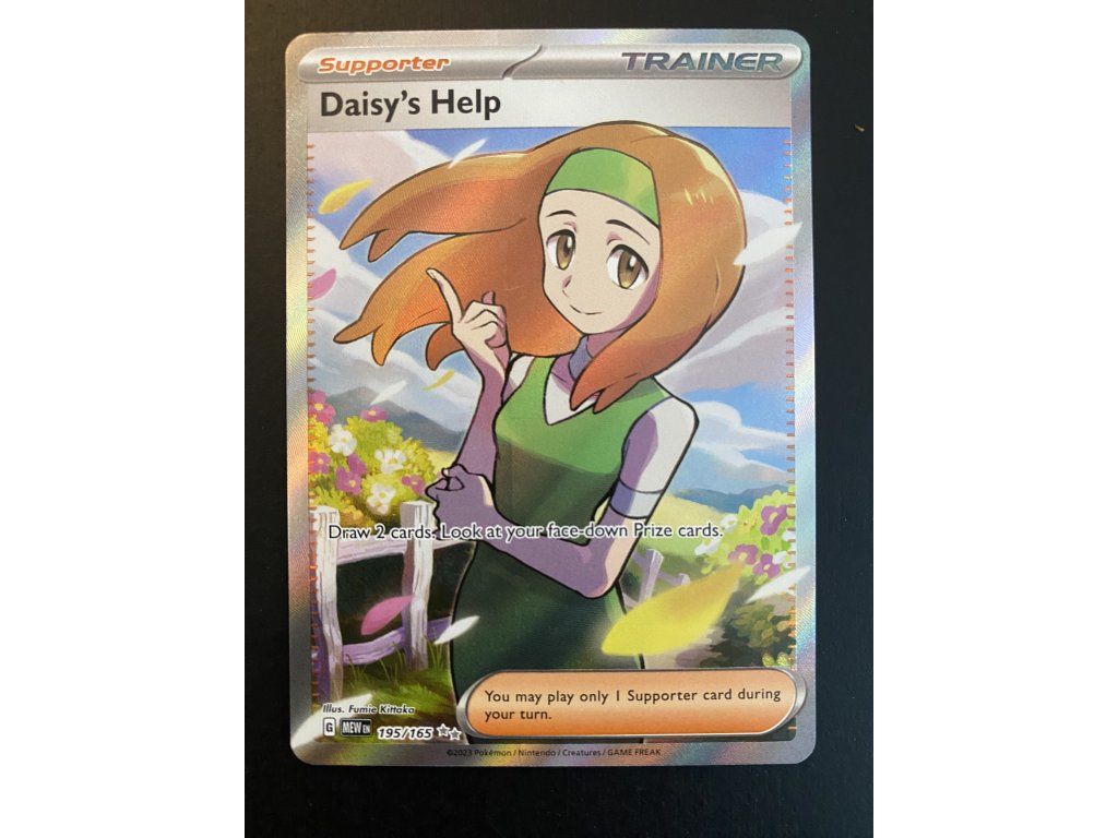 Kusová Pokémon karta Daisy's help 195/165 pochází z edice Scarlet & Violet—Pokémon 151. Jedná se o originální kartu v anglickém jazyce, vhodnou především pro sběratele, případně pro hraní Pokémon TCG.