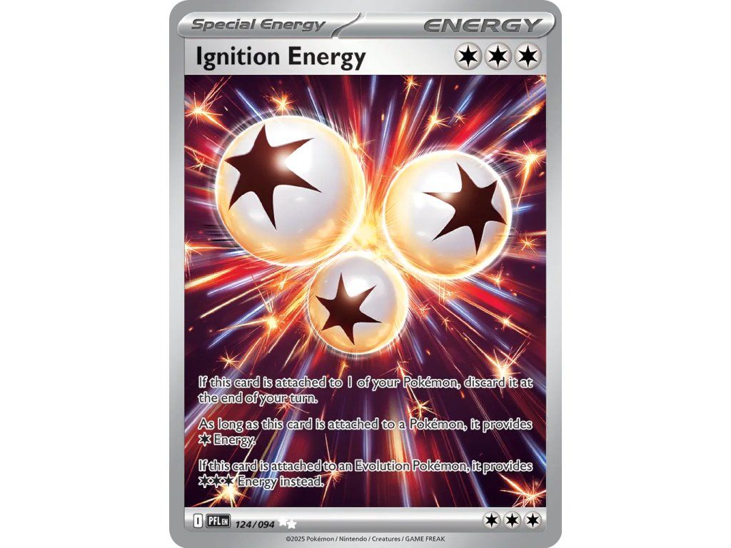 Kusová Pokémon karta Ignition Energy 124/094 pochází z edice Mega Evolution—Phantasmal Flames. Jedná se o originální kartu v anglickém jazyce, vhodnou především pro sběratele, případně pro hraní Pokémon TCG.