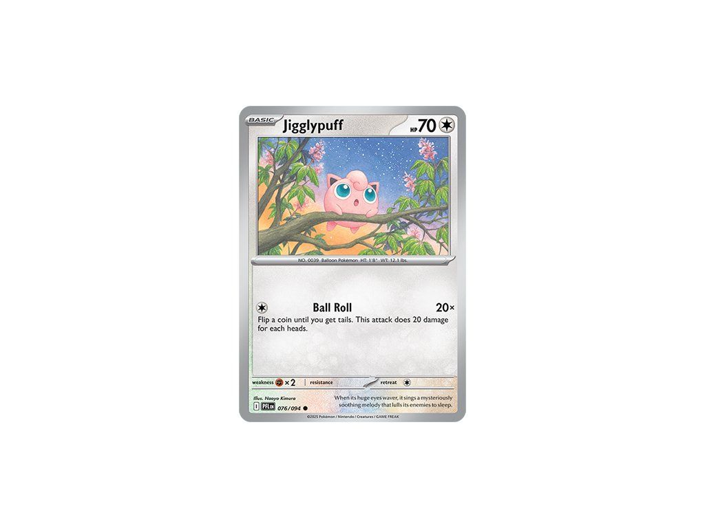 Kusová Pokémon karta Jigglypuff 076/094 REVERSE HOLO pochází z edice Mega Evolution—Phantasmal Flames. Jedná se o originální kartu v anglickém jazyce, vhodnou především pro sběratele, případně pro hraní Pokémon TCG.