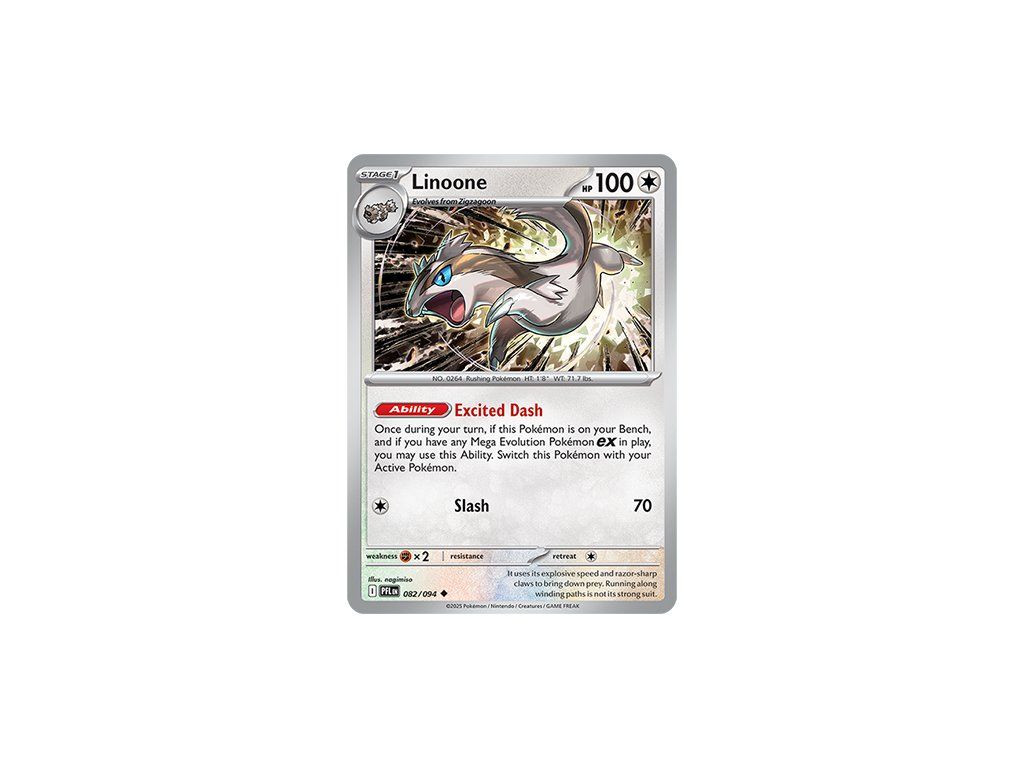 Kusová Pokémon karta Linoone 082/094 REVERSE HOLO pochází z edice Mega Evolution—Phantasmal Flames. Jedná se o originální kartu v anglickém jazyce, vhodnou především pro sběratele, případně pro hraní Pokémon TCG.