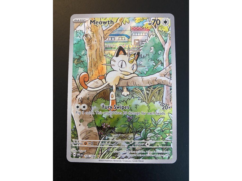 Kusová Pokémon karta Meowth 106/094 pochází z edice Mega Evolution—Phantasmal Flames. Jedná se o originální kartu v anglickém jazyce, vhodnou především pro sběratele, případně pro hraní Pokémon TCG.