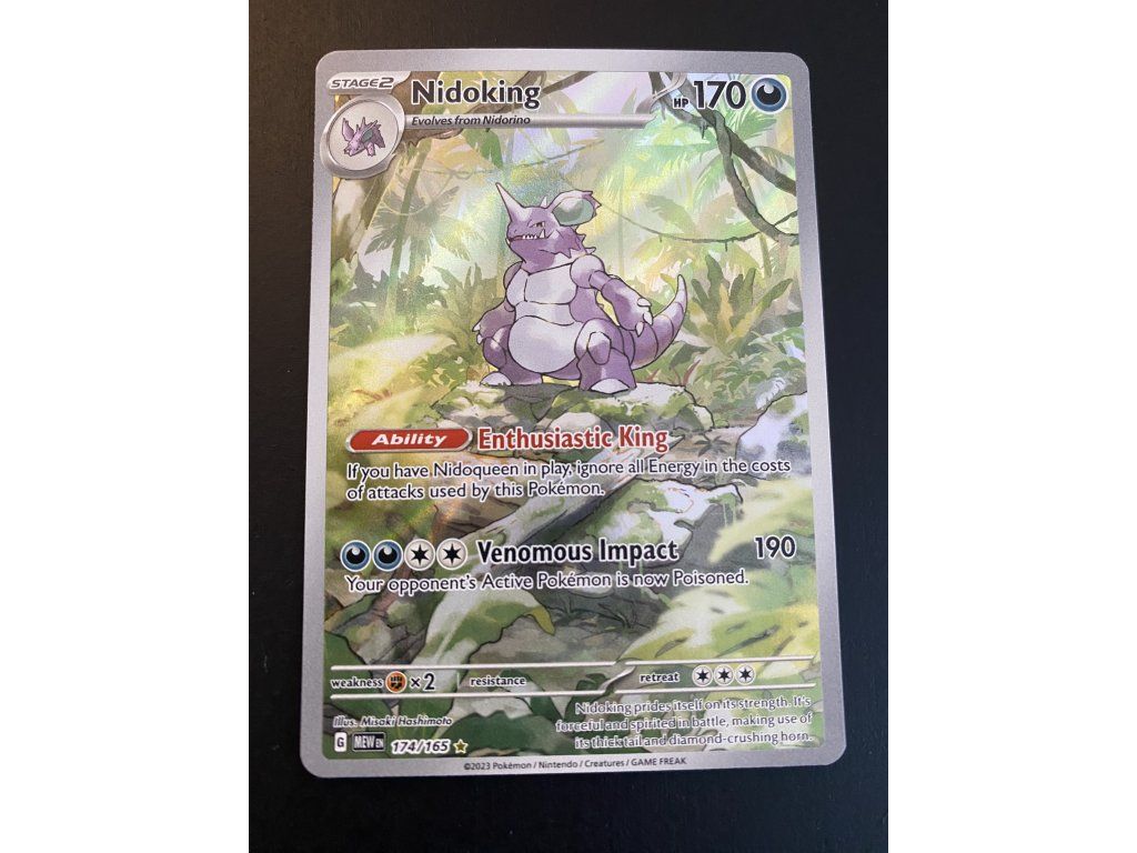 Kusová Pokémon karta Nidoking 174/165 pochází z edice Scarlet & Violet—Pokémon 151. Jedná se o originální kartu v anglickém jazyce, vhodnou především pro sběratele, případně pro hraní Pokémon TCG.