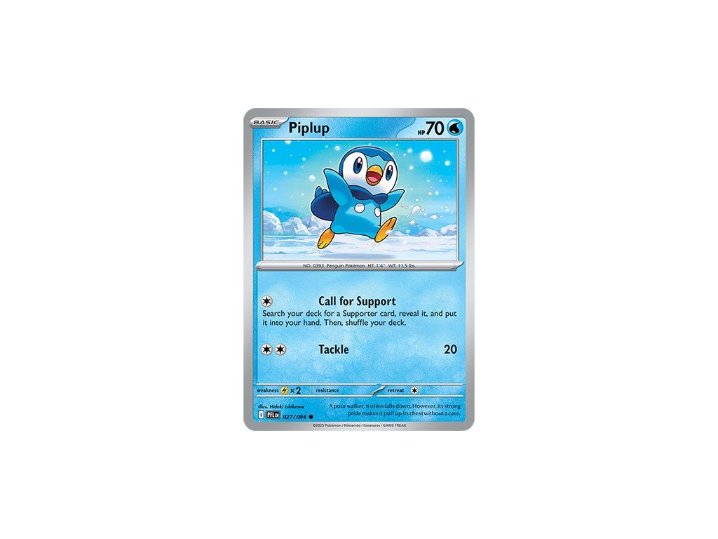 Kusová Pokémon karta Piplup 027/094 REVERSE HOLO pochází z edice Mega Evolution—Phantasmal Flames. Jedná se o originální kartu v anglickém jazyce, vhodnou především pro sběratele, případně pro hraní Pokémon TCG.