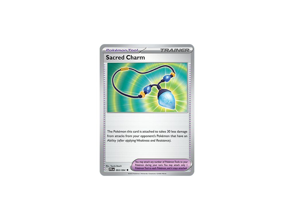 Kusová Pokémon karta Sacred Charm 093/094 REVERSE HOLO pochází z edice Mega Evolution—Phantasmal Flames. Jedná se o originální kartu v anglickém jazyce, vhodnou především pro sběratele, případně pro hraní Pokémon TCG.