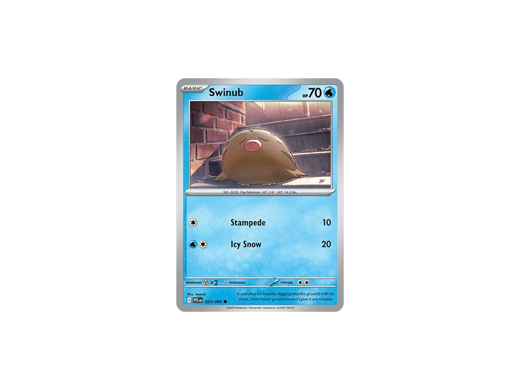 Kusová Pokémon karta Swinub 023/094 REVERSE HOLO pochází z edice Mega Evolution—Phantasmal Flames. Jedná se o originální kartu v anglickém jazyce, vhodnou především pro sběratele, případně pro hraní Pokémon TCG.