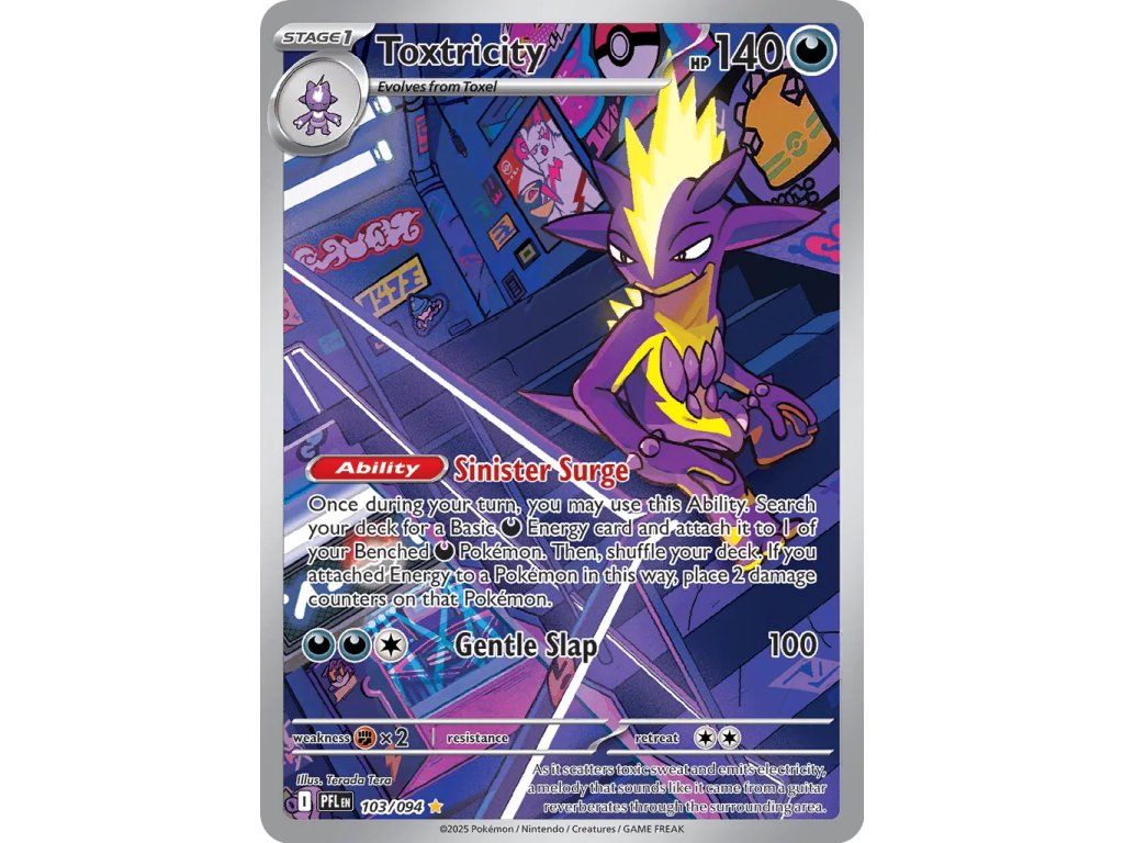 Kusová Pokémon karta Toxtricity 103/094 pochází z edice Mega Evolution—Phantasmal Flames. Jedná se o originální kartu v anglickém jazyce, vhodnou především pro sběratele, případně pro hraní Pokémon TCG.