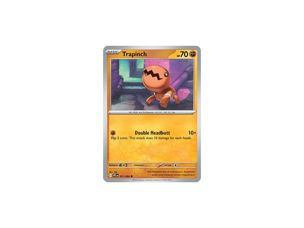 Kusová Pokémon karta Trapinch 051/094 REVERSE HOLO pochází z edice Mega Evolution—Phantasmal Flames. Jedná se o originální kartu v anglickém jazyce, vhodnou především pro sběratele, případně pro hraní Pokémon TCG.