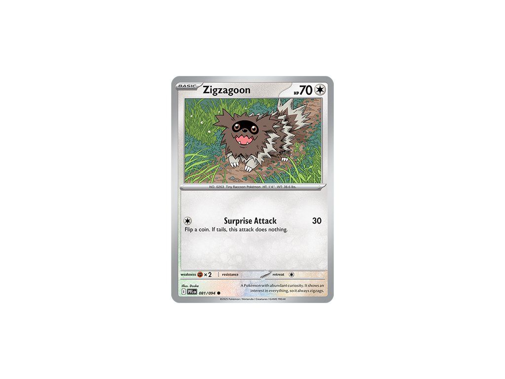 Kusová Pokémon karta Zigzagoon 081/094 REVERSE HOLO pochází z edice Mega Evolution—Phantasmal Flames. Jedná se o originální kartu v anglickém jazyce, vhodnou především pro sběratele, případně pro hraní Pokémon TCG.
